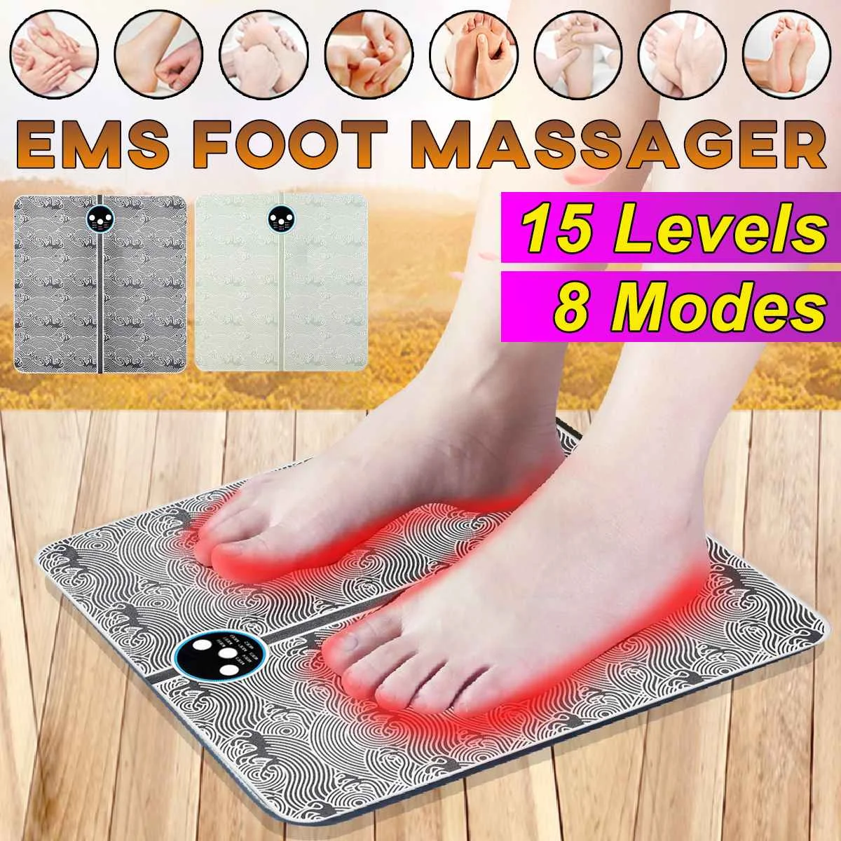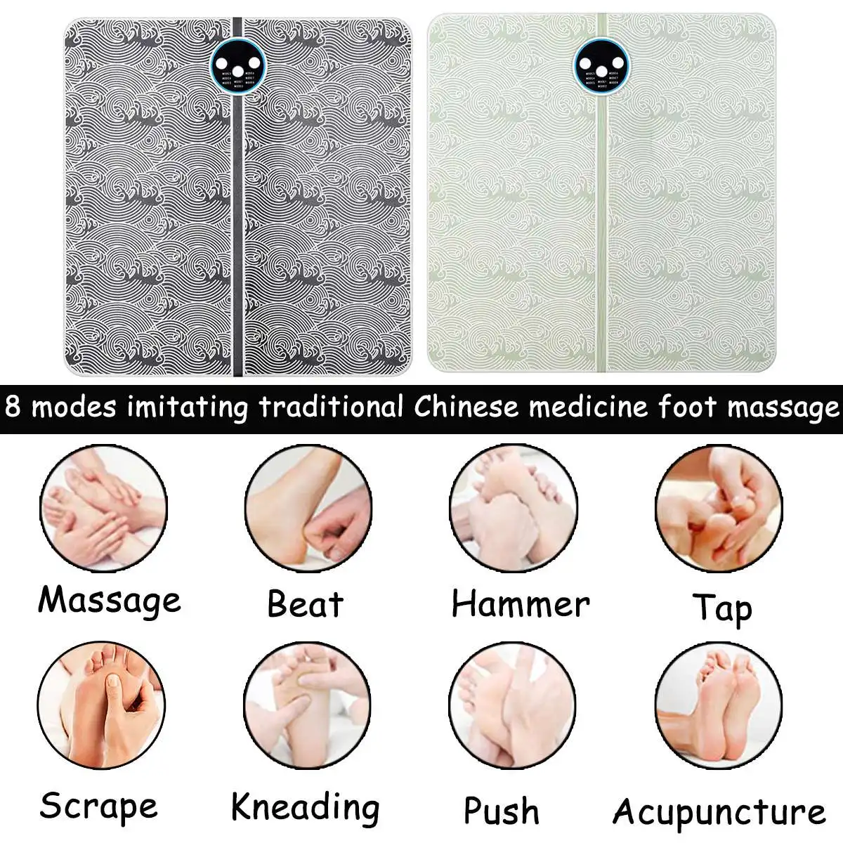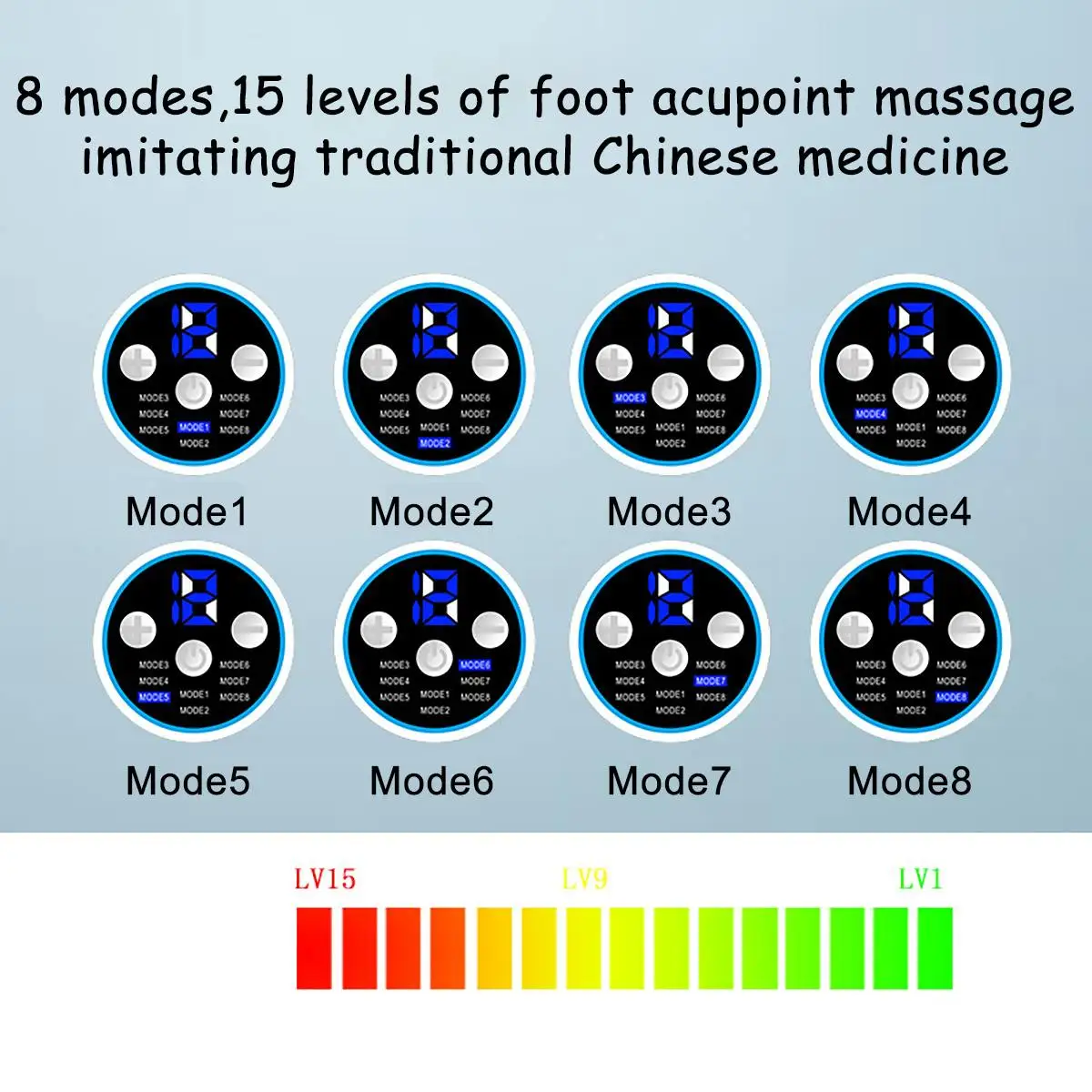 -8 modes, 15 levels of foot acupoint massage imitating traditional Chinese medicine.